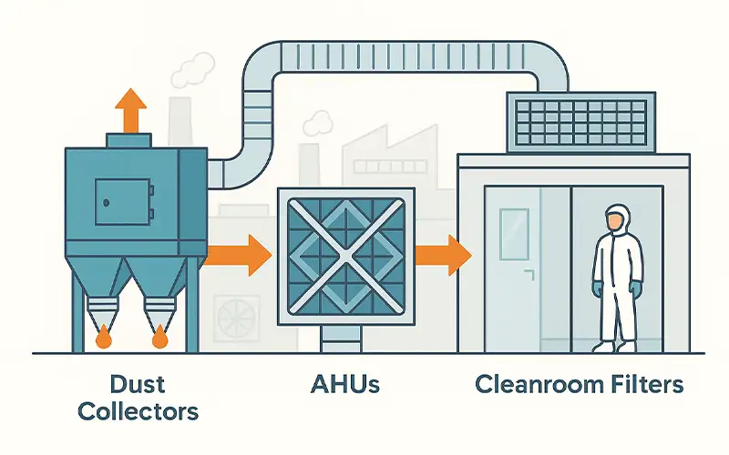 Compliance with industry-specific regulations, such as ISO cleanroom standards or OSHA workplace safety guidelines, is a key factor in planning installations. Properly installed dust collectors and AHU filters also reduce fire hazards by minimizing the accumulation of combustible dust, contributing to safer operations.