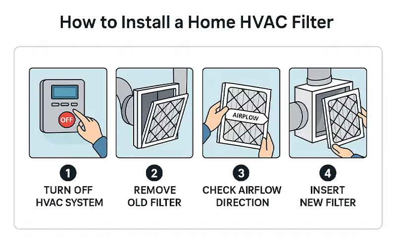 Installing or replacing filters in a residential air filtration system is one of the most important steps in maintaining clean air indoors. For a standard home HVAC filter installation or furnace filter replacement, the process typically includes:
