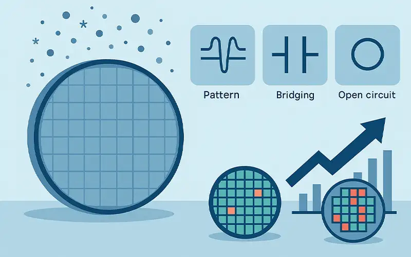Particles comparable to local critical dimensions distort photoresist profiles (pattern deformation), create conductive paths across adjacent lines (bridging), or block vias and trenches so metal fail to connect (opens).